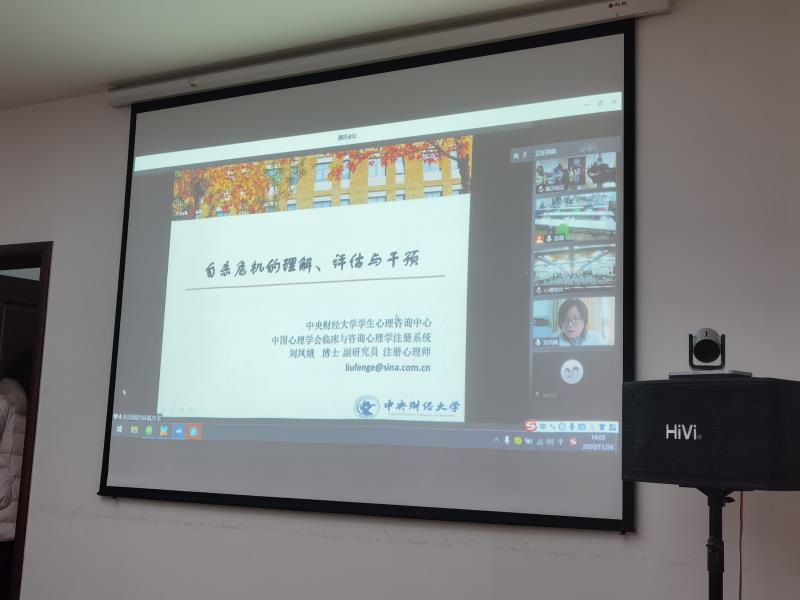 培训分为两期,第一期主题为《自杀危机的理解、评估与干预》。刘教授结合自身多年从业经验,从对自杀的理解、自杀评估、自杀干预等三个方面对大学生自杀行为的原因和心理特征进行了系统、专业的分析和解读,强调在自杀评估中要注意既往经历、认知因素、诱发因素及保护性因素,在自杀干预中应通过制定安全计划等方式为学生提供多种帮助,通过帮助让有自杀倾向的人活下来。