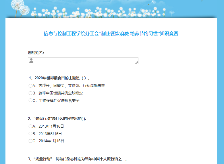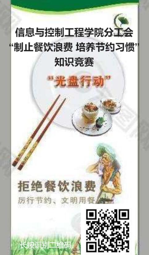 根据《永利集团3044官网欢迎您“制止餐饮浪费 培养节约习惯”行动方案》的通知要求,12月14日至16日,信息与控制工程学院分工会开展“制止餐饮浪费 培养节约习惯”线上知识竞赛活动,近120名教职工参加了此次活动,该活动得到了校工会的大力支持。