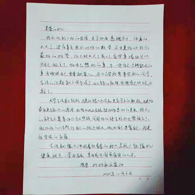 更为出彩的是,此次“一封家书寄真情”活动,不只有学生单向地寄出感念,更有家长回信作为加分项。“多锻炼自己、多奉献爱心、尽力去帮助需要帮助的同学”,这是财管207班陈晓丽家长回信中对她的殷殷嘱托。“遗子黄金满赢,不如教子一经”,父母也借此机会立之以规,喻之以理。紧扣家书活动的目的,传承家书文化,互表心意感情,正是最真实感情的流露。
