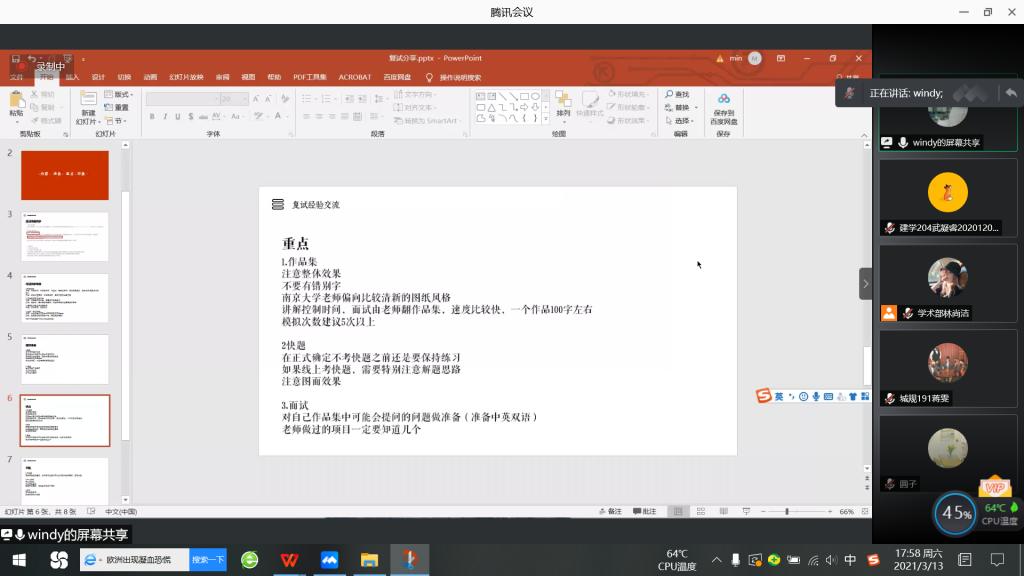 为帮助考研同学成功通过考研复试,积累复试经验,搭建优秀学长学姐与复试学生零距离沟通的平台,3月21日下午,建筑与城乡规划学院举办“X-talk”考研复试经验线上交流会。学院分团委书记、学工办主任王鹏飞,就业辅导员张宇参会。