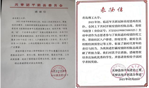 近日,环境与市政工程学院分别收到来自共青团平阴县委、无棣县海丰街道党工委表彰学院学生党员董鑫江、马晓慧同学的感谢信。