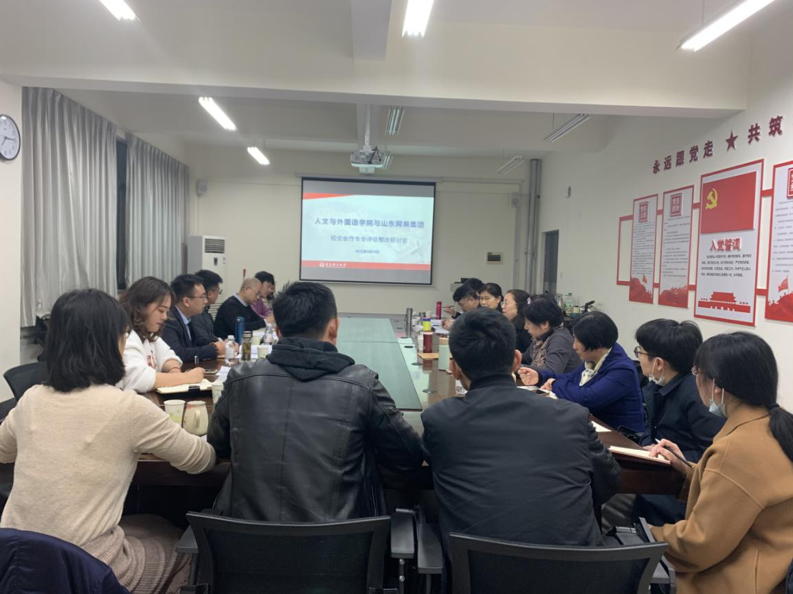 3月23日晚上,人文与外国语学院领导班子成员与英语(跨境电商方向)校企合作方山东网商集团高校事业部总经理杨嵩棠一行6人在学院会议室召开校企合作专业建设研讨会,共同探讨了校企合作专业建设的相关问题。