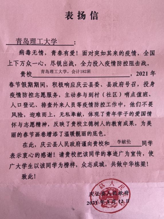 近日,商学院收到了一封来自德州市庆云县人民政府的表扬信,信中对商学院会计182班李献伦同学2021年春节期间在疫情防控志愿服务工作中的突出表现进行了表扬和感谢。