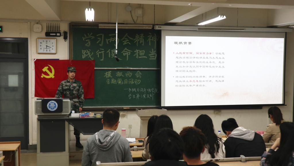 3月31日,机械与汽车工程学院学生第三党支部开展以“学习两会精神,践行使命担当”为主题的模拟两会主题党日活动。党支部书记徐卫晓,辅导员殷宗华、王文超担任评委。支部全体学生党员,2018级、2019级和2020级各班团支书及学生代表参加了会议。