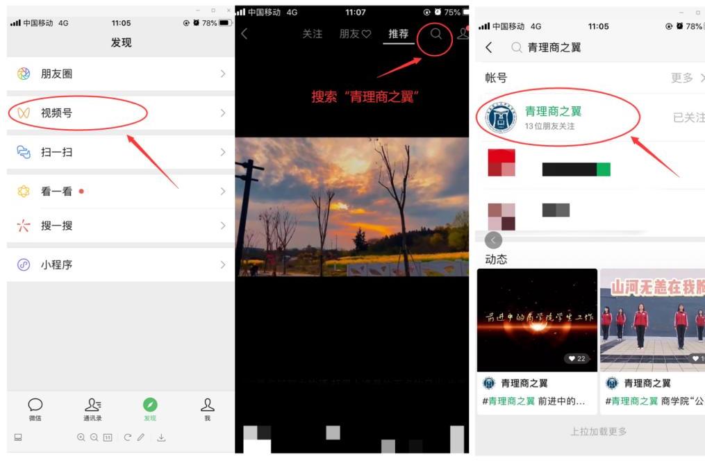二、打开微信App进入“发现”,点击“视频号”,在最上方找到点击“放大镜”图标,搜索“青理商之翼”即可关注。