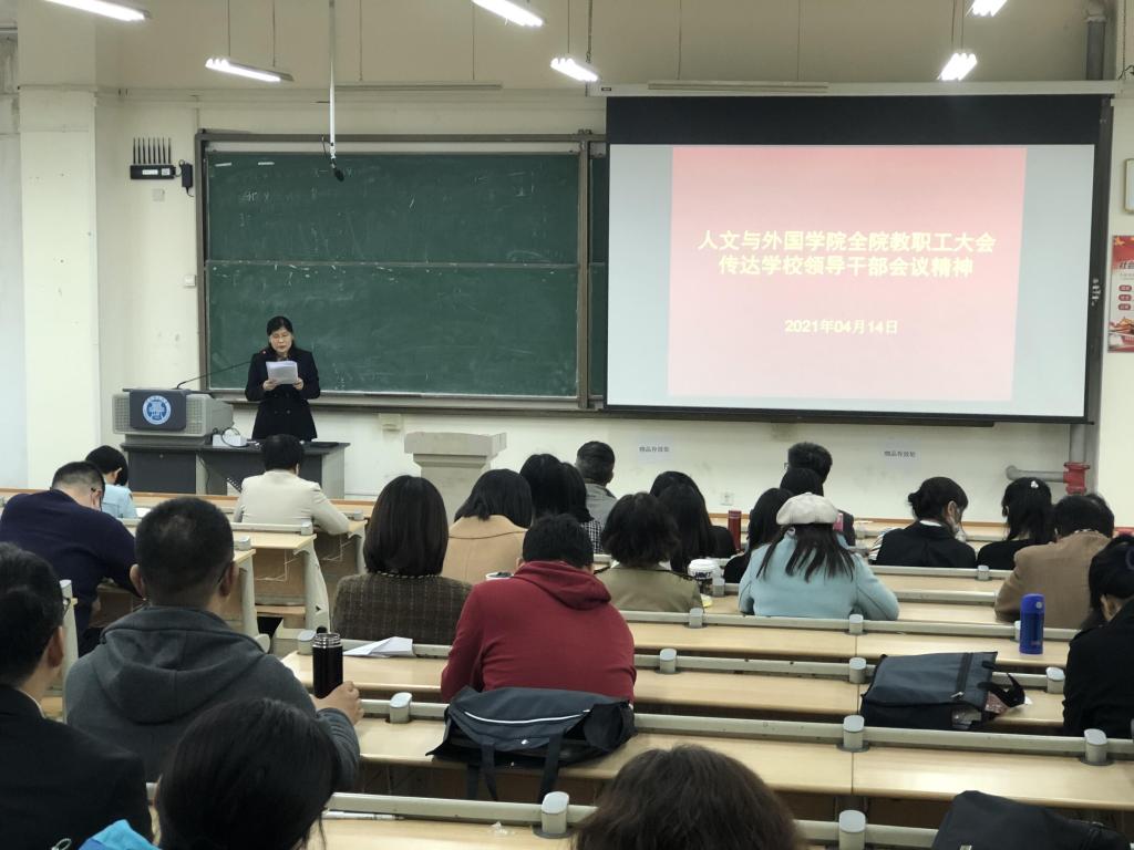4月14日下午,人文与外国语学院在嘉陵江路校区1号教学楼B301召开全院教职工大会,集中传达部署学校中层班子调整会议精神。会议由学院党总支书记王新主持,学院领导班子、全体教职工参加本次会议。