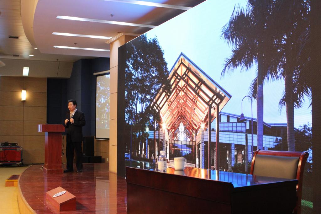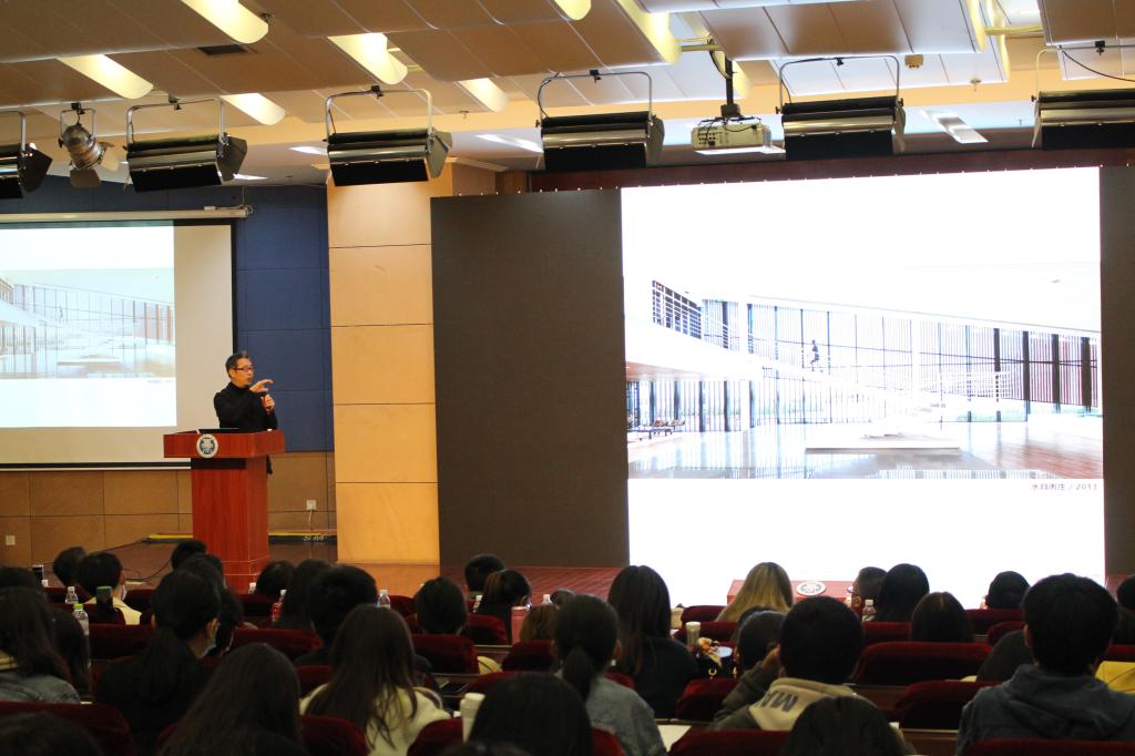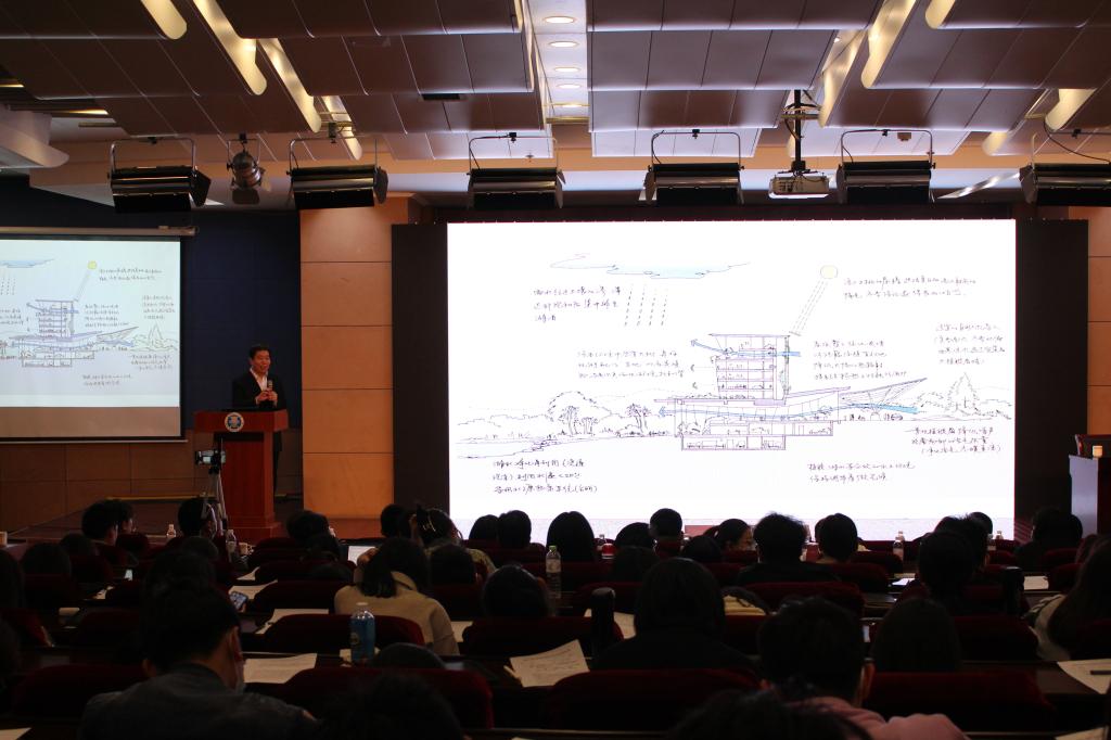 王兴田简单系统地介绍了建筑设计中“在地”的定义,即强调建筑物本身与所处的大地以及形成于其上的文化、风土等地域特性的依附关系。王兴田着重强调了五维度:自然维度、建构维度、人文维度、生态维度、时间维度,并通过自己参与设计的各方案为在场师生分析了五维度对不同种类建筑设计的重要影响,为同学们打开了关于建筑更加广阔的视野。通过案例引申至建筑与环境和谐发展问题的时候,王兴田表达了在建筑设计过程中尊重自然的态度,要充分的利用设计场地的自然因素,并将自然因素与建筑物融合。同时,设计需要充分尊重地域的社会、文化、生活方式等人文环境,以及在其影响下所产生的价值,探求一个可与自然和谐共处、提升人居舒适度的设计理念。他在分析中国2010上海世博会韩国馆时为同学们深入讲解了建筑外形设计灵感的来源,并提出建筑内部空间的“符号空间化”,令到场学生受益匪浅。讲座中,王兴田详细介绍了他设计的珠算博物馆、何振深奥林匹克博物馆、上海世博会韩国馆等多个建筑案例的设计过程,具体分析建筑空间对建筑的重要性,及如何让建筑空间设计同时满足多种不同人群的空间需求。