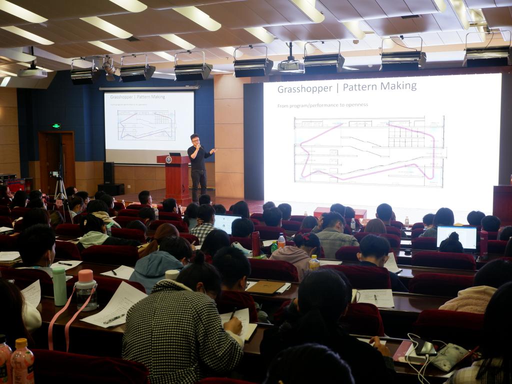 张雷为同学们带来了“创新与多样化案例分享”的学术报告,他首先对工作团队及团队成员进行介绍,强调团队是一个“多元化、研究型、创新设计”的团队。随后,他通过分析上海海克斯康城市展厅、斐济Malolo Island Resort、华润杭州国际医养综合体、金茂温州鳌江城市展厅、华侨城淄博河滨文创风情街五个代表性案例,帮助同学们更灵活地寻找方案前期的切入点。
