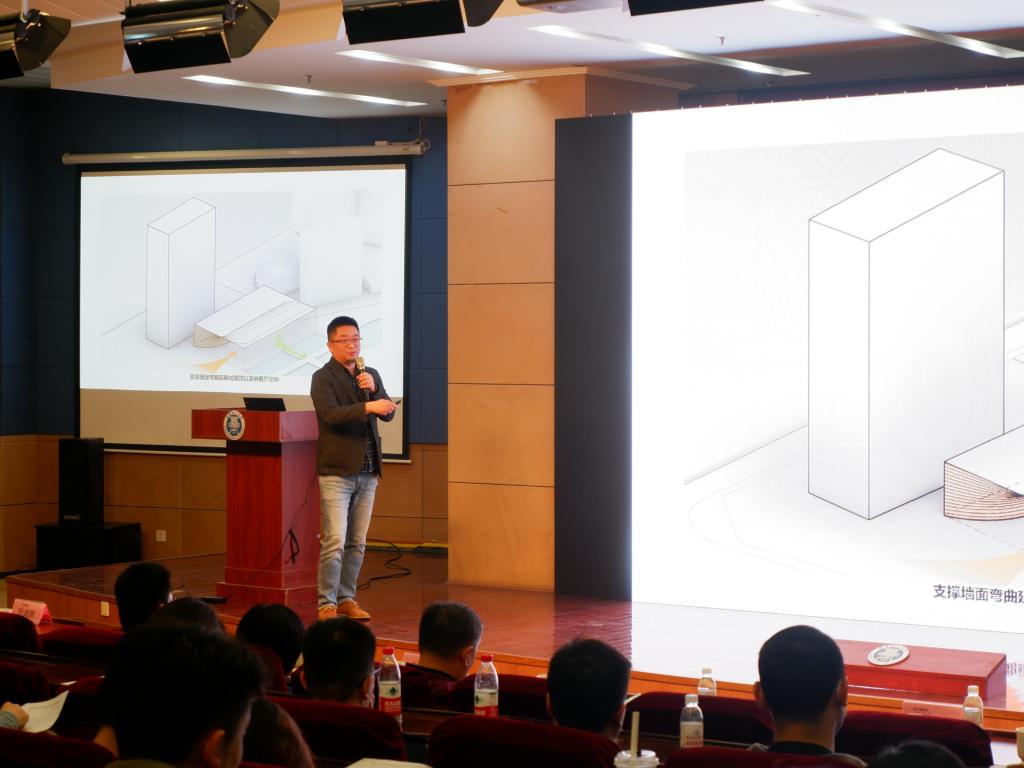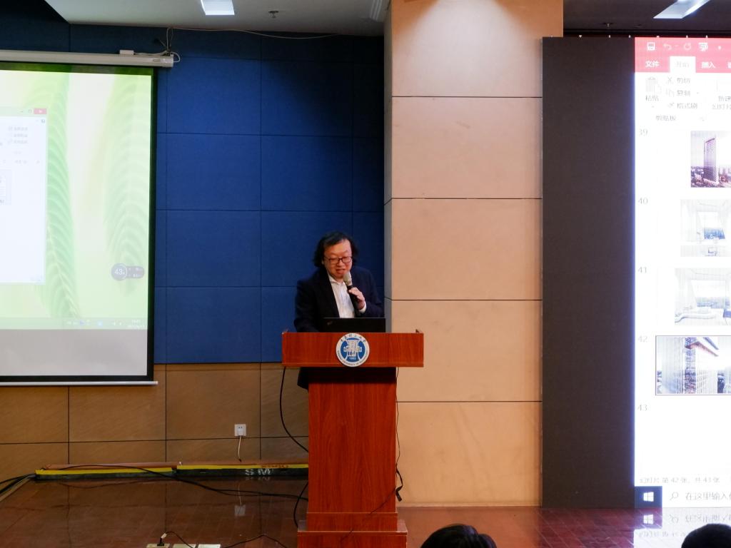 在“建筑玩家”为主题的讲座报告中,厉鸿凯讲述了自己的个人经历及建筑设计观念。他提出三点设计理念——“PALYFUL=有趣”“PLAYER=职业工作流程”“PLAYING=持续忘我”,引出尖叫设计万象城店,认为“觉得既然一切都是假的,那么就假起来也就理所当然,假要假的疯狂。”他随后向同学们分享了亚利桑那州立大学医学科学研究中心的案例,着重讲了疏密有致的陶板体系及陶板的烧制方法。最后分别向同学们介绍武汉长江新城总部塔楼、河南集团总部塔楼等项目案例。