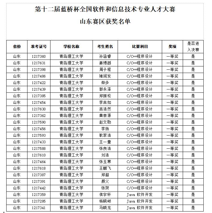 4月28日,第十二届“蓝桥杯”全国软件与信息技术专业人才大赛省赛成绩公布。我校信息与控制工程学院学子获山东赛区一等奖24人、二等奖36人、三等奖63人。孙涵睿、姜博越、周子程、褚润发、柴多、郭永泽、郑振松、李吉如、吉浩然、黄崇源、赵文勋、李扬、耿家浩、王一童、张良浩、刘浩、张玉寒、王鹏飞、郑超、颜义和张贺获得C/C++程序设计B组一等奖,侯宇轩 、杨晓岐和马晓龙获得JAVA软件开发B组一等奖。获得一等奖的选手将于6月参加全国总决赛。