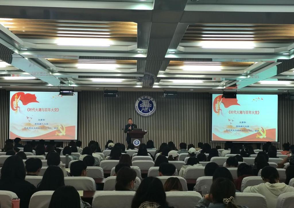 5月6日,商学院在东报告厅举办《时代大潮与百年大党》党史学习教育专题讲座。本次讲座由马克思主义学院党总支书记王菁华主讲,商学院党委副书记董兰国主持,全体辅导员,以及党员和入党积极分子代表总计三百余人参加本次党史学习教育。