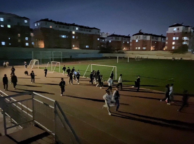 随后,同学们带着荧光饰品围绕操场开启夜跑生活。本次活动分为夜跑组与夜跑交友组,同学们线上报名后,每晚完成打卡要求即可在线下完成签到。本次最具特色的夜跑交友组通过“与你同行”卡片将报名同学进行两两配对,卡片以中国红为底色,将金色的“100”字样凸显出来,象征着中国共产党百年来奋斗的光辉历程。卡片背面依旧以红色为底色,信息表右下角两个身着军装的卡通人物以挺拔敬礼的姿态向中国共产党致敬。