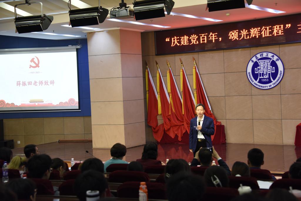 本次主题思政课展演为《思想道德修养与法律基础》课程的有效延伸,以中国共产党党史为时间轴线,分五个篇章进行,每个篇章包括演讲、朗诵和配音三种展演形式,共计14个展演项目,打造了一场场面庄重、形式新颖的可视化思政大课。展演开始之前,薛振田首先致辞。他指出,本次主题思政课展演旨在学党史,悟思想,知党情,跟党走,将抽象的理论讲授与生动的文艺展演相结合,把封闭的思政课堂延展到开放的大学生课外实践活动,希望各位同学在本次展演中有所收获,感悟党的百年峥嵘岁月。