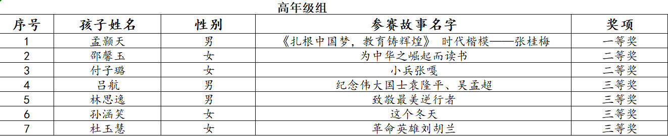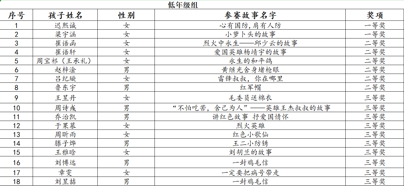 比赛以录制讲故事短视频的方式参赛,共收到学前、小学、初中三个年龄段作品38个,共评出一等奖4个、二等奖12个、三等奖22个。