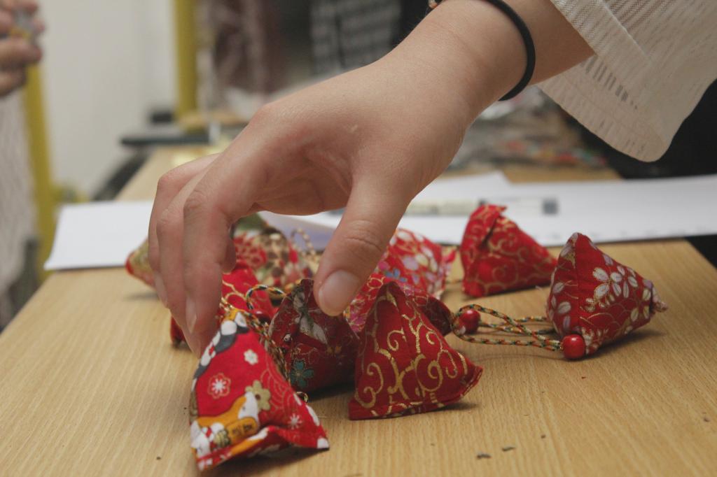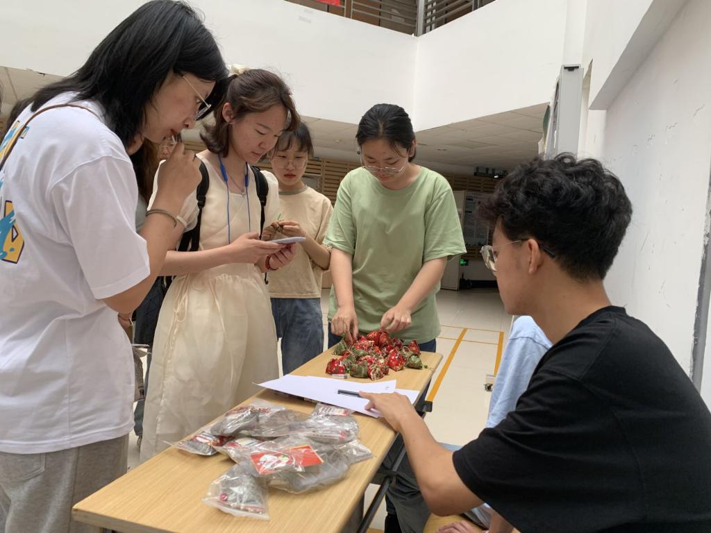 “香囊祈福”活动现场,学院学生会于建筑馆三楼中庭为同学们准备了端午香囊,传递节日祝福。同学们认真挑选自己喜欢的香囊,回味端午祈福的传统。有不少同学现场手工制作香囊,将传统的棉麻布料与和风、刺绣和流苏相结合,缝制成粽子形状后填充艾草。整个过程既锻炼了同学们的动手能力,又将同学们与所牵挂之人的感情相联结。