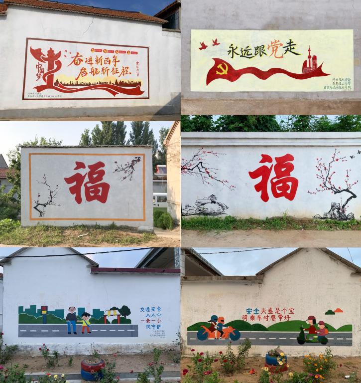 在河西庄村绘制的墙面中,有象征着中国近年来蓬勃发展的“中国梦”主题,有把党的精神像撒种子一样撒播进乡民心田间的“永远跟党走”主题,也有象征吉祥如意的迎门墙“福”字绘制。在江家官庄村,团队又完成了交通安全教育主题墙绘,形象鲜明可爱的小人配以简明有力的标语,让村庄的每个人都能了解交通安全知识,自觉遵守交通准则。