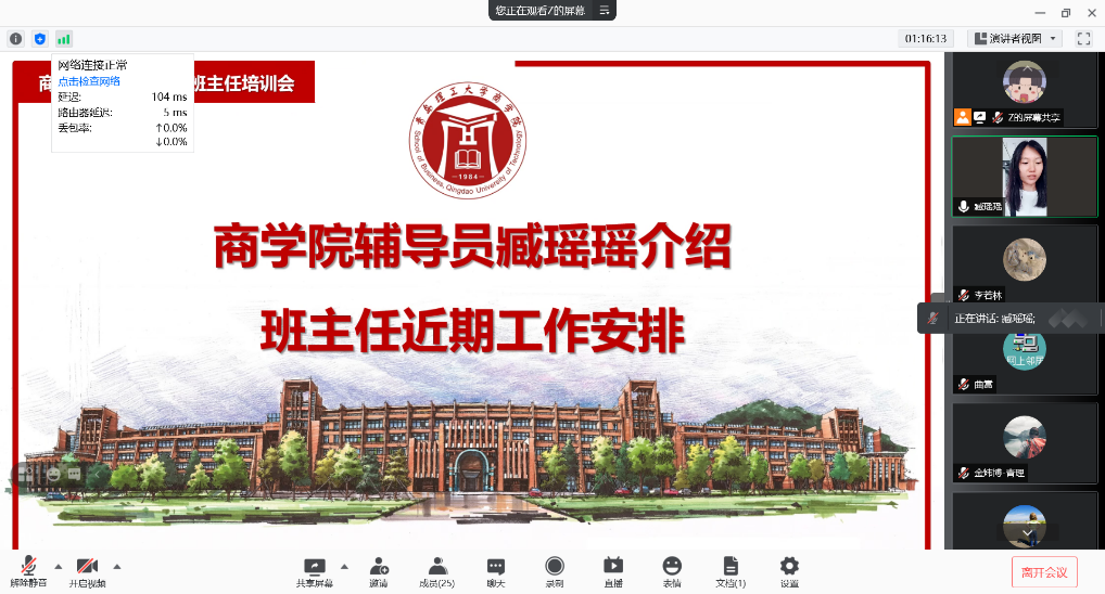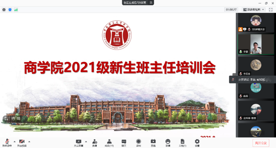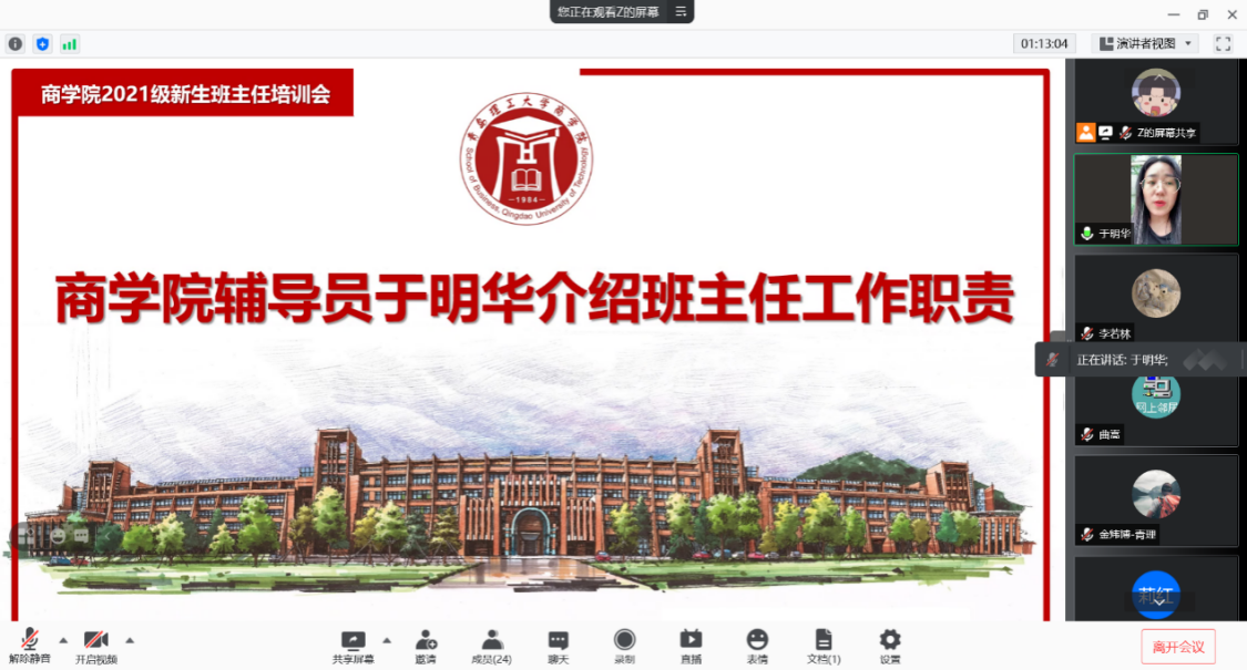 为提升学院班主任队伍的管理能力和业务水平,强化班级为载体的思政教育阵地,切实增强育人的实效性,扎实做好2021级新生报到及入学教育工作。8月27日上午10点,商学院召开2021级新生班主任线上培训会。商学院党委副书记、副院长李慧,商学院2021级新生辅导员臧瑶瑶、于明华及2021级全体新生班主任参加,会议由臧瑶瑶主持。
