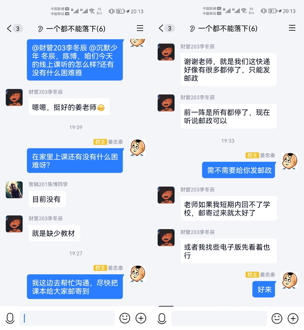 辅导员时刻关注学生需求,实时解决学生学业困难:一个都不能落下,是目标更是责任。为了更好了解未返校同学的动态,商学院辅导员和未返校同学建起了QQ群,并命名为“一个都不能落下”,辅导员们每天和未返校同学沟通现实需求:“咱们今天的线上课听得怎么样,有没有什么困难?”“课听得很好,就是缺少教材。”“我去帮大家沟通一下,尽快把课本给大家邮寄过去。”这样的对话跳动在屏幕上,温暖着同学们的心。当了解到同学们在家没有教材后,商学院老师以最快速度将教材用快递邮寄至同学们手中。财管203班李冬辰信心满满地说道:“商学院的老师对我们非常关心,给予了我们很大的帮助,我们在与老师的沟通中我们也体会到了老师工作的辛苦,我们定不会辜负老师的期望,不辜负老师对我们的付出,居家期间认真学习,一个人都不会掉队,一门课程都不会落下!”