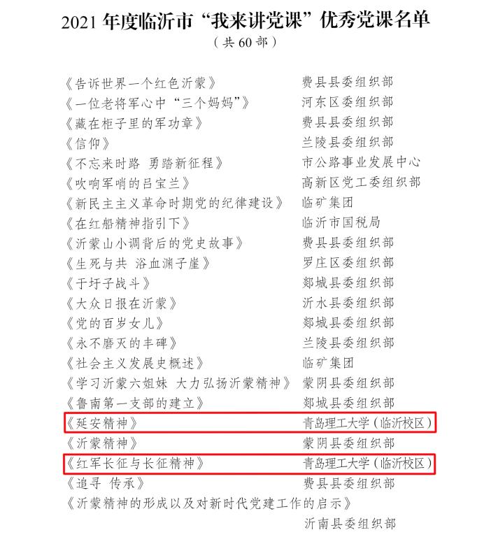 近日,临沂市委组织部办公室印发《关于2021年度临沂市优秀党员教育电视片评选获奖作品和“我来讲党课”优秀党课的通报》,临沂校区管理工程系学生第四党支部书记田庆爱的“延安精神”和学生工作部荆龙的“红军长征与长征精神”2篇党课被评为临沂市优秀党课。