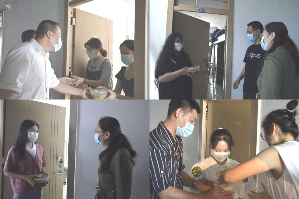 迎新当天中午,学院领导班子前往新生宿舍,为正在隔离的省外新生送上热腾腾的青理第一碗面!院长巩湘红说,“这是新生在学校吃的第一顿饭,咱们好客山东迎客的习俗就是’上车饺子下车面’,就让这一大碗面传递全院师生对新生的深情厚谊”。敲开隔离宿舍的门,阳光洋洋洒洒从窗间流淌进明朗整洁的宿舍、铺满小床,老师们将热气腾腾的面条亲手递给还未解除隔离的新生,她们惊讶又惊喜,热腾腾的香气氤氲在空中,每个人的笑脸在朦胧中却格外清晰,暖意浓浓,分外温馨,这就是隔离病毒却隔离不了爱吧。