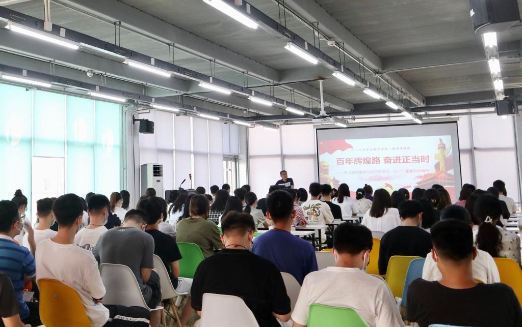 肖学斌为全体同学解读了“百年辉煌路,奋进正当时”,从四个方面概括了习近平总书记在建党一百周年大会上的重要讲话精神,鼓励同学们深刻领会习近平总书记“七一”重要讲话的实践意义,树立远大理想,厚植爱国情怀,脚踏实地,做好本职工作,在实践中经风雨、见世面、长才干。
