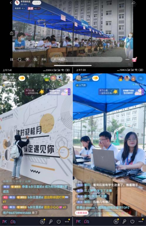 迎新当天,学院通过抖音、BiliBili等媒体平台直播迎新现场,给因疫情不能进入校园了解现场报道情况的新生家长们提供了亲临校园的便捷途径。新生家长通过直播了解现场情况,并由学院志愿者同学为评论区家长的留言进行解说,做好新生与家长之间的联系纽带。