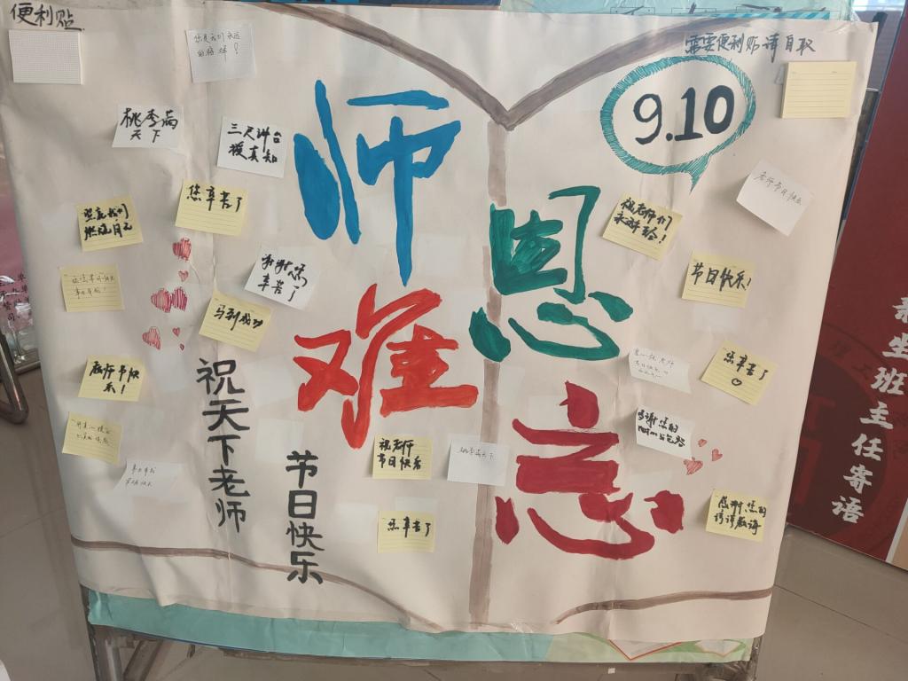有的班级以吟唱或朗诵的方式,向在学校各个岗位默默付出的教职工送上祝福。有的自发组织同学们通过主动打扫教室、办公室、实验室等工作场所的方式,将对老师的感恩之情外化于行,以实际行动回馈老师的淳淳教诲。更有学子将内心的感激编撰成一首首饱含真挚感情的三行诗,为广大教师献上衷心的祝福,工管201陈长旭写到:当您托起了一片片云彩,云彩看到了世界,您却总看着云。学院楼前的展板上也张贴满了学子们对老师的祝福,同学们用一张张字条写出了最想对老师说的话,制作成祝福墙,见字如面、纸短情长、师恩难忘,道出了对老师的深深感激和诚挚热爱。