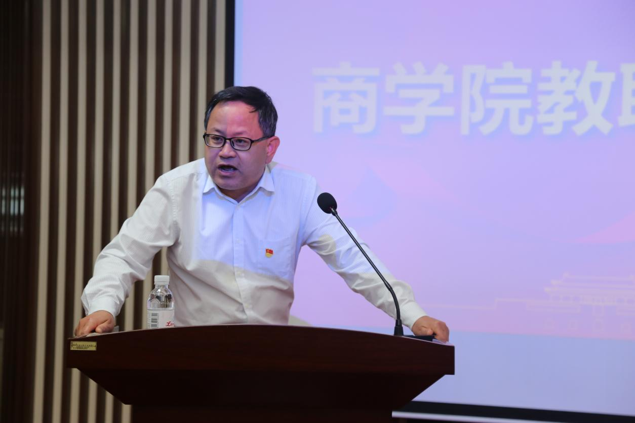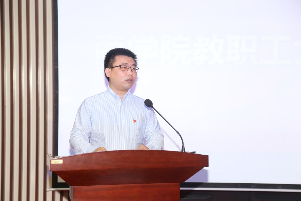 会议伊始,王粲向全体教职工汇报了学院整体工作,向学院全体教职工介绍了学院新进教师和学校党委对商学院领导班子的调整以及分工情况。