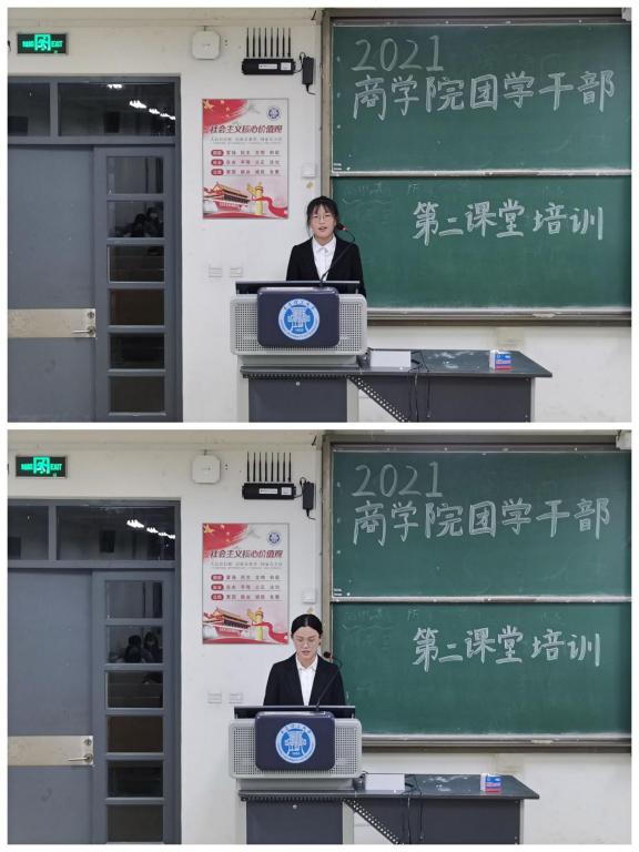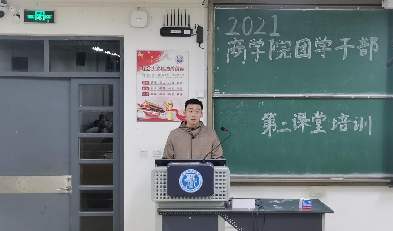 薛诚首先向参会学生介绍了学院团委兼职学生干部各部门和学院学生会组织架构和负责事项,指出本次培训会议是商学院团委持续开展团学干部作风整顿,维护学生权益的举措,希望各团支部重视班级第二课堂工作,充分发挥“到梦空间”作为第二课堂活动载体作用,组织班级全体同学认真学习“第二课堂成绩单”制度,引导班级同学德智体美劳全面发展。