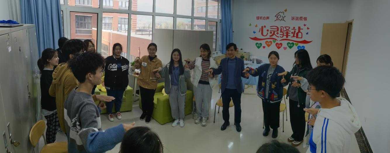 10月24日上午,学院团委书记宋晓峰、辅导员韩群组织“理心坊”工作站成员开展团辅活动,通过诸多小游戏“手心手指”、“相互捏肩膀”、“分小组交流”和等活动增进工作站成员之间的友情, 感受同学们之间给予的温暖和关怀,帮助同学们将各种心理健康理论落实到实践。