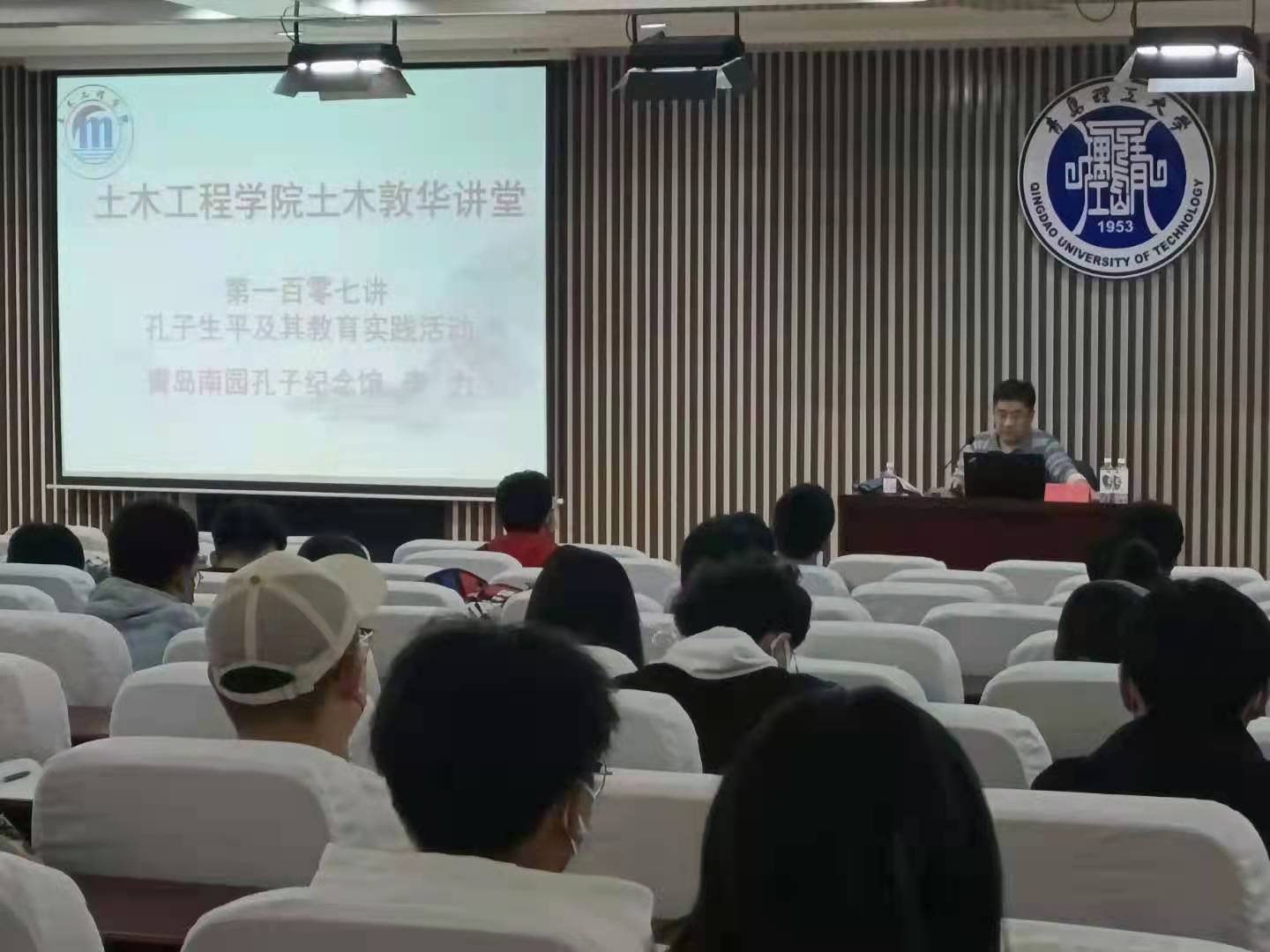 为进一步弘扬中华优秀传统文化,提高学院学生人文素养,10月28日下午,土木工程学院举办了第107期土木敦华讲堂,邀请青岛南园孔子纪念馆馆长李力为学院广大师生做了“孔子生平及教育实践”的主题讲座。学院党委副书记、副院长邵先锋,学工办主任、团委书记王俊富一起聆听了报告。