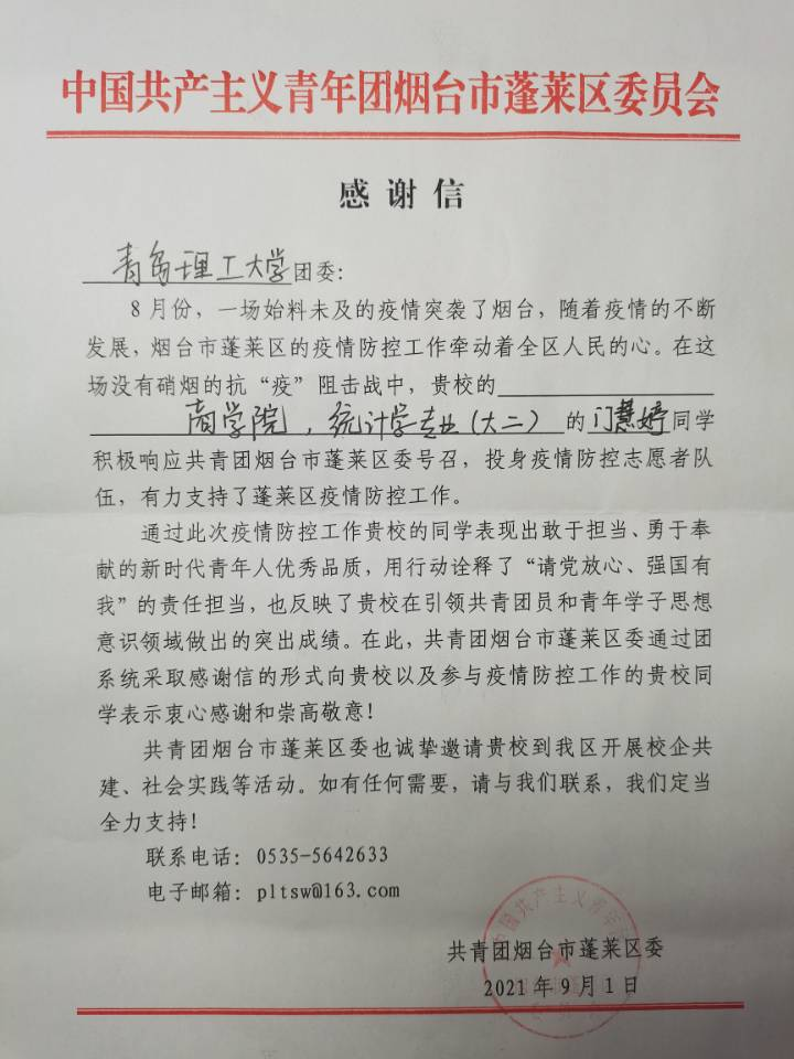 近日,一封来自共青团烟台市蓬莱区委的感谢信被送至商学院老师手中,信中对投身疫情防控志愿者队的统计201班门慧婷同学表示感谢。