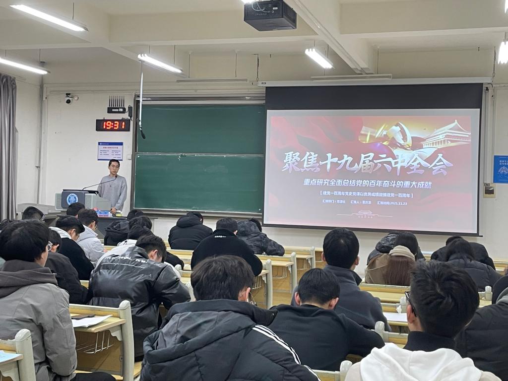 董庆昱带领大家共同学习了党的十九届六中全会精神,他表示,作为新时代大学生,我们沐浴在党的光辉下成长,应当始终跟进党的步伐、关注党的发展建设、关注国家发展命运,将自己融入时代发展的大潮。