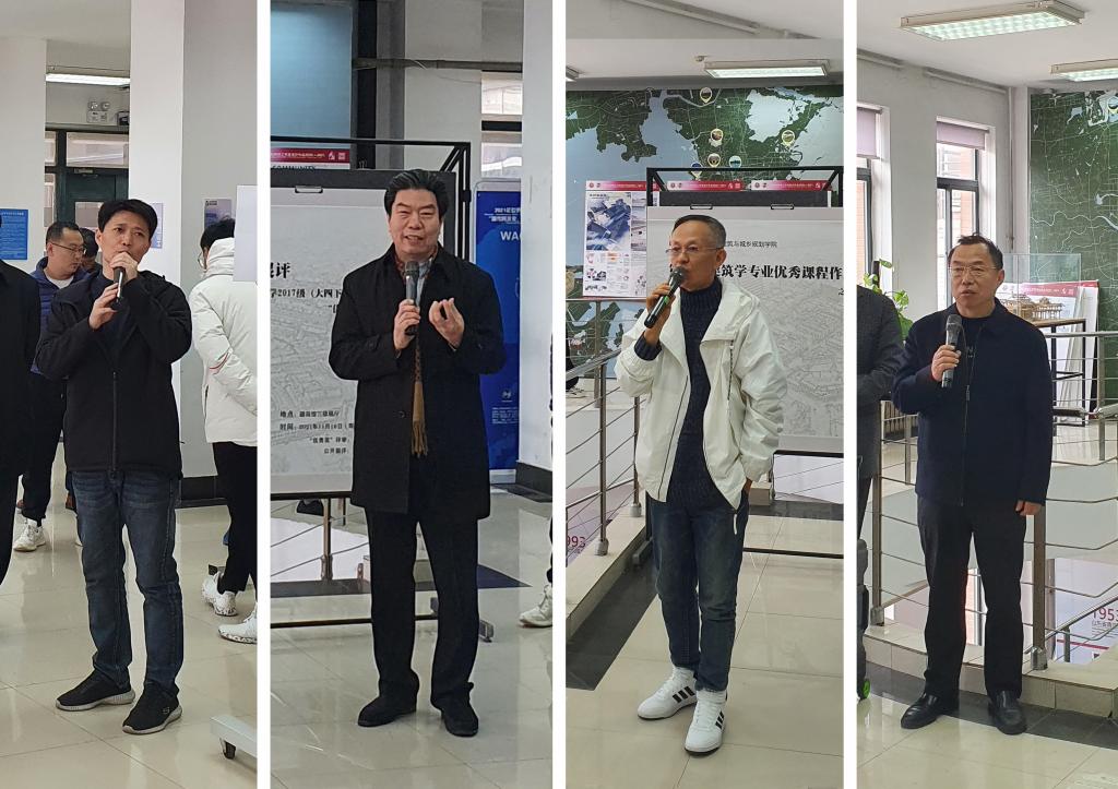 展评中,王兴田教授、郝赤彪教授、王润生教授、副院长解旭东、王少飞主任分别致辞,他们对同学们的建筑设计作业进行了综合评讲,同时给同学们提出了中肯且极具价值的意见。解旭东阐明此次作业评展旨在促进各导师组之间交流,加强互动学习,发挥导师组教学模式及教学体系优势,希望各位同学从中取长补短,取得更大进步。王兴田表示,大四课程设计是从小体积建筑到整个城市规划的转变,他指出,同学们现阶段设计的不能只局限在小范围空间范围,要从社会、城市等更大层面考虑建筑师发挥的作用,希望同学们转换角色与思路,重新定位设计的出发点。郝赤彪对同学们的设计能力表示认可,对大家在学习过程中不断思考、完善作品的态度表示肯定,强调了城市尺度在大四建筑设计中的重要性,考虑从单体设计到城市设计的思路转变,进而解决城市问题。王润生提出,同学们要关注建筑在城市中与周边环境的关系、与周边建筑的关系,在设计过程中注意加强相互之间的协调,满足城市空间中人群多样化的活动需求。他希望同学们不断反思自己的作品,进行纵向分析,真正在课程设计训练中有所收获。