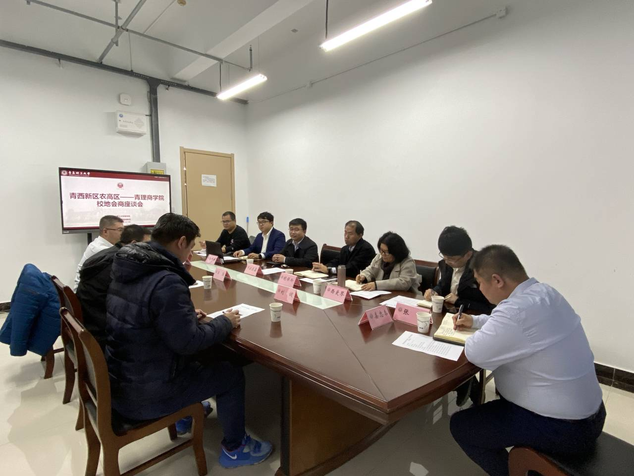 胡保玲对青西新区农高区领导一行的到来表示欢迎,并详细介绍了学校发展概况,重点介绍了商学院学科设置、师资力量、人才建设和科研发展等方面的工作。王强详细介绍了青西新区农高区的发展概况,围绕省级农业高新区的战略升级,并对“数智农业、高新农业和都市农业”等方面进行了重点介绍。