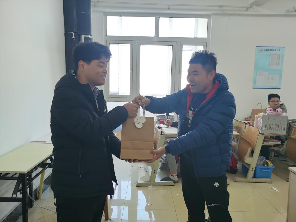 李洪民及全体辅导员老师来到考研自习室,将学院精心准备的300余个暖心考研“福袋”送到考研学生手中。并鼓励考研学子在复习的关键阶段,要坚定必胜信心,保持良好心态,科学作息,规律饮食。礼袋里“连中三元”系列文具寓意考研同学一战成功、金榜题名;脐橙,寓意考研同学能够心想事“橙”、“橙”心如意;牛奶,希望能给考研同学补充营养,让同学们感受到考研路上充满温暖。同学们看到老师们亲手送来的礼物感到十分惊喜和温暖。