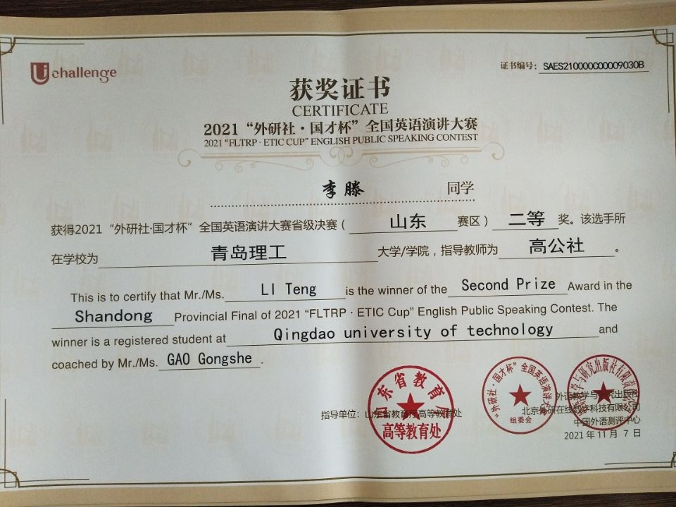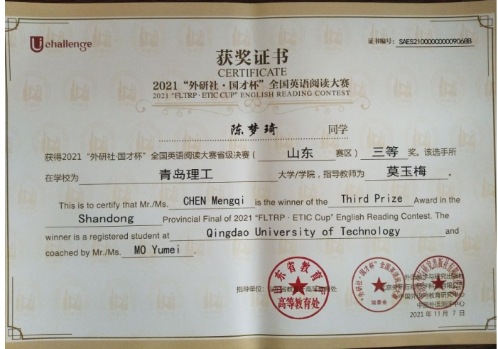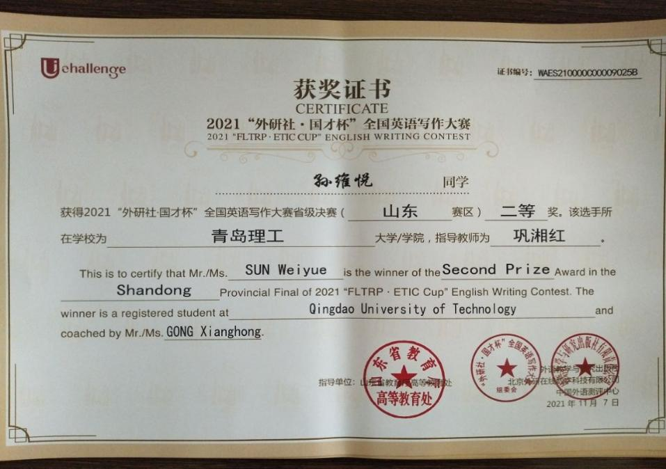 近日,从全国大学生英语挑战赛组委会获悉,在2021年“外研社·国才杯”全国大学生英语挑战赛(演讲、阅读、写作)山东省复赛中,我校参赛的六位选手发挥出色,荣获二等奖两项,三等奖一项,优秀奖三项。这是我校在外研社系列比赛中取得的新突破,表明我校英语类竞赛的总体水平和整体实力正逐步提升。