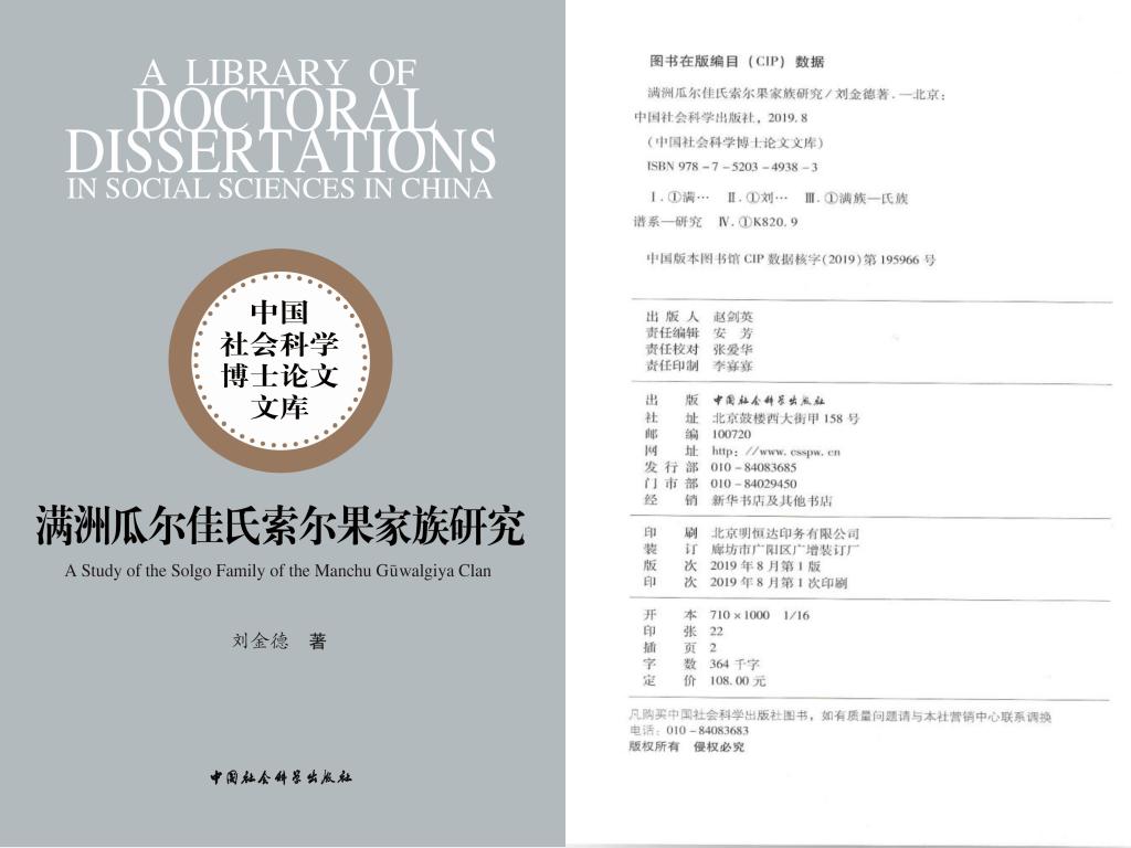 《满洲瓜尔佳氏索尔果家族研究》一书入选2018年度《中国社会科学博士论文文库》,2019年由中国社会科学出版社资助出版,出版后《历史档案》《满族研究》等刊物发表书讯书评予以推介。全书除绪论、参考文献、索引、后记外,由五章构成,近40万字。该书以满洲瓜尔佳氏索尔果家族为研究对象,立足于《清实录》等基础史料,充分运用满汉文档案、各类族谱,对索尔果家族兴起的社会历史背景,家族各支系的发展脉络、族人事迹、家族佐领、旗分和爵秩,以及婚姻关系和家族历史地位等问题予以分析考证,附录部分作者罗列了索尔果家族佐领、婚姻和封爵汇总表,以及家族谱系图。该书在充分尊重学术界研究成果的基础上,对族人事迹的考证极为精详,弥补了以往研究中的一些不足;对家族佐领、旗分变化的探讨是一个崭新的视角;对家族婚姻关系的梳理展现了清代满洲贵族间婚姻往来的政治意义。(撰稿:陈刚;审核:李龙强)