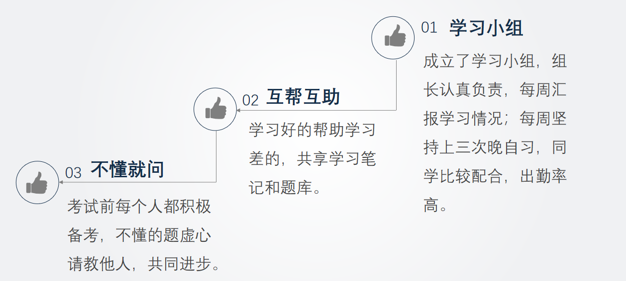 朋辈互助“抓学风”。“学情分析”主题班会。“学情分析”主题班会是学院促进学风建设的传统做法,由本班学习委员对班级学情进行详细分析,横向纵向对比分析班级学习成绩、查找班级出现的学情不足及原因、提出寒假和下学期的学习提升改进方法。通过此项工作,充分发挥班级学风建设带动作用,凝聚班级向心力,提升班级学习成绩,是抓好班级学风建设的重要抓手。