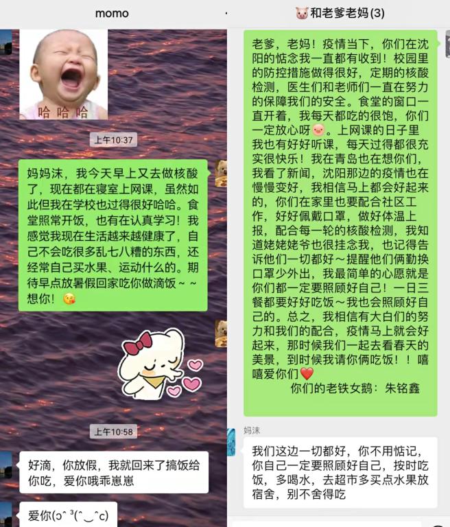 此次活动同学们以线上“家书”的形式“云”寄平安,给父母们传递一份平安,传递一份思念,同时将学校的防疫要求,生活学习状态告知父母。造价193李子龙写道,“亲爱的爸爸妈妈,距离我返校已经过去三周了,很想念家里妈妈做的肉包子和爸爸做的锅包肉。食堂的阿姨们做的饭菜种类丰富,而且香喷喷的。虽然青岛出现疫情,但一切向好,学校采取了有力的管控措施,保障我们的健康和安全。我每天都会去图书馆学习,去操场上锻炼身体。请爸爸妈妈放心,疫情当前我会做好,应该做好的事情,做一个健康向上的好青年......”