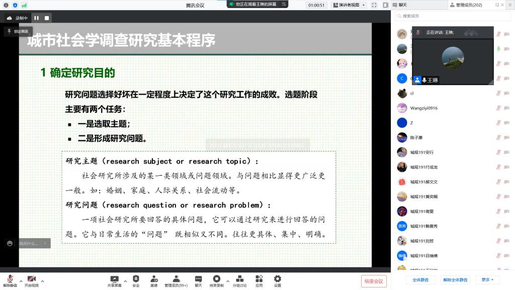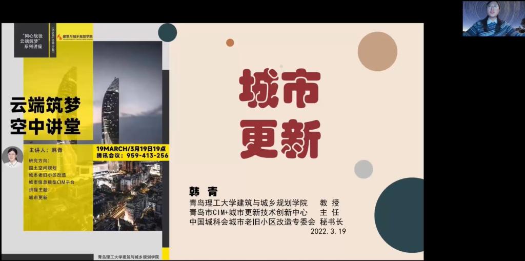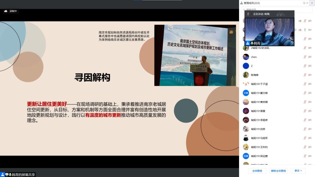 教授代表——韩青,从本校学生获得“南京国图杯”首届全国大学生国土空间规划设计竞赛三等奖讲起,以“南京老城区”城市更新为例,从经典到现实,从理论到实际,为同学们提供了极具思想性和理论性的学术盛宴。结合自身调研经历,深入浅出地向学生讲述老城区更新的理念,并着重强调在改造过程中,对老城区市井生活气息保存的重要性。同时,韩青带领学生深入剖析城市信息模型CIM平台,通过对全国各具试点城市更新的举例与论述,帮助同学们了解巩固关于城市更新的理念与程序。在讲座最后,通过线上问答的形式,与学生展开关于城市改造与空间更新的交流,线上问答氛围热烈,互动积极,同学们纷纷表示受益匪浅。
