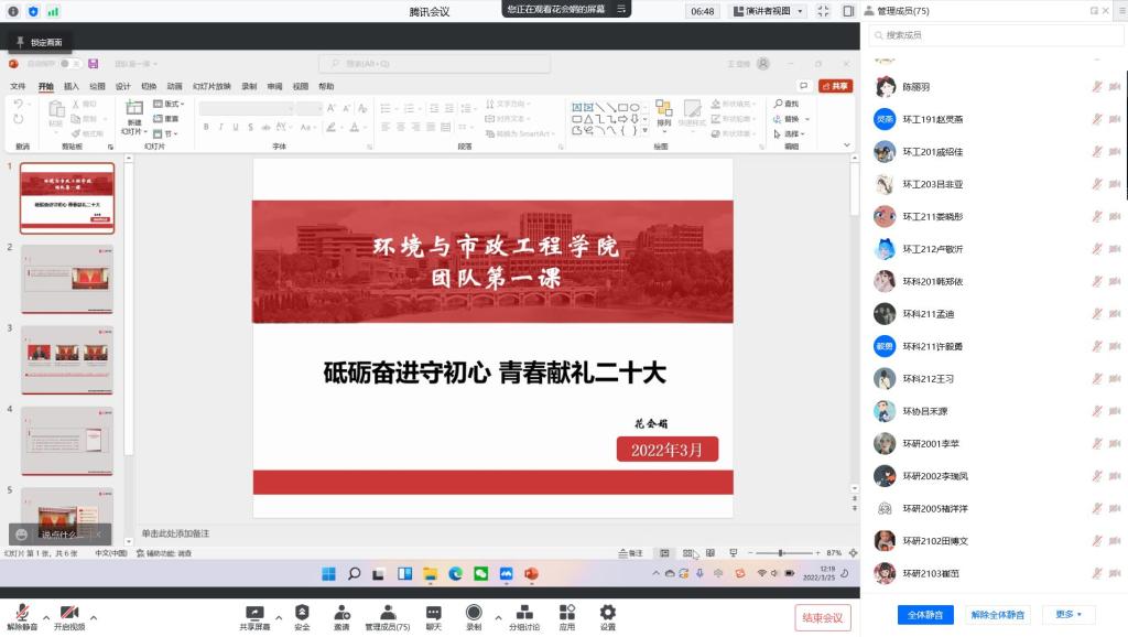 为深入学习贯彻党的十九大和十九届历次全会精神,贯彻落实习近平总书记关于青年工作的重要思想,持续巩固深化拓展党史学习教育成果,教育引导广大青年学生坚定不移听党话、跟党走,庆祝建团100周年,以奋发向上的精神状态迎接党的二十大胜利召开。环境与市政工程学院开展“砥砺奋进守初心 青春献礼二十大”团队第一课,上好青年学生思政课。