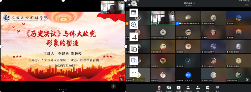 “小社团大思政”共上一场鲜活生动的思政大课。人文与外国语学院红星学社社团以线上思政云课堂的形式,举办“社团思政理论”第一课,76名学生骨干集中在“云”端听课。社团业务指导教师马克思主义学院李建勇副教授,以“《历史决议》与伟大政党形象”为主题,从“伟大成就塑造伟大政党形象”“自我革命塑造浩然正气的政党形象”“两个确立塑造团结的政党形象”等五个层面,深刻地论述伟大政党形象塑造的历史与发展过程,以红色理想信仰为引领,激励学生持续传递爱党爱国爱社会主义的热情,坚定信心、砥砺奋进,向第二个百年奋斗目标踔厉前行。活动过程中,同学们认真听讲,积极互动,纷纷表示受益匪浅。广告191班黄俊扬表示:“作为新时代的大学生,我会不断加强自身的政治理论学习,勇于担当,切实发挥学生干部的表率作用”。