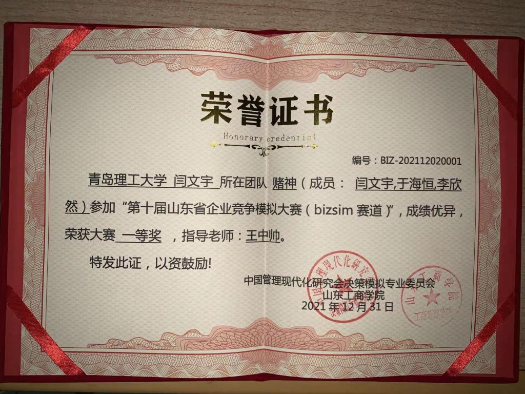 近日,由高等学校国家级实验教学示范中心联席会指导,全国高校教育技术协作工作委员会、中国管理现代化研究会决策模拟专业委员会共同举办,山东工商学院承办的2021年山东省企业竞争模拟评审结果公布。管理工程学院两支代表队,从全省80支参赛队伍中脱颖而出,赌神队(队员:闫文宇、于海恒、李欣然)获一等奖,Song of Sunset队(队友:叶宇杰、杜志强、李柏宇 )获三等奖,王中帅获评优秀指导教师。