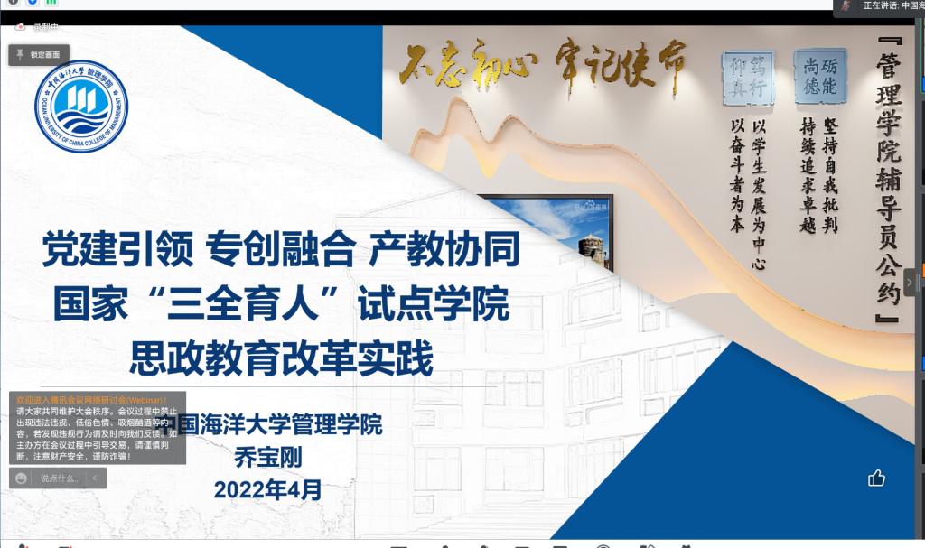 据悉,2018年10月,中国海洋大学管理学院获批国家首批“三全育人”综合改革试点单位,该学院结合学校、学院实际开展了大量工作,取得了显著成效。本次论坛既有丰富的理论知识讲解,又有扎实的实践经验传授,为我校“三全育人”工作提供了积极借鉴意义。