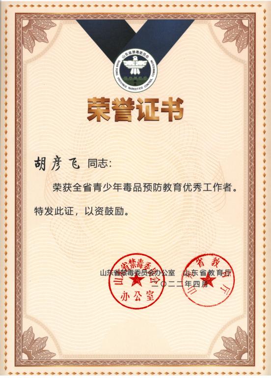 为认真贯彻落实全省新一轮三年禁毒人民战争毒品预防教育工程,坚决打赢新时代禁毒人民战争,近日,山东省禁毒委员会办公室、山东省教育厅对全省优秀青年毒品预防教育先进个人进行了表彰,临沂校区保卫部副主任胡彦飞荣获“全省青少年毒品预防教育优秀工作者”称号。