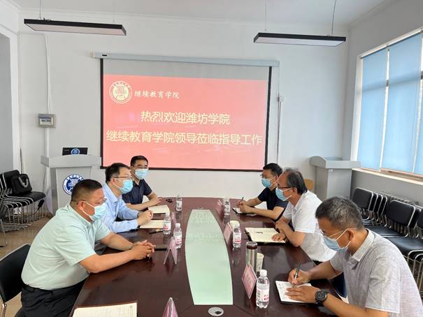 6月13日,潍坊学院继续教育学院党总支书记韩建栋、院长王长春,继续教育科科长刘凤楼一行三人到我校继续教育学院调研。继续教育学院党总支书记孟凡勇、院长王乐生、副院长辛益军及学院党政办公室负责同志参加座谈交流。