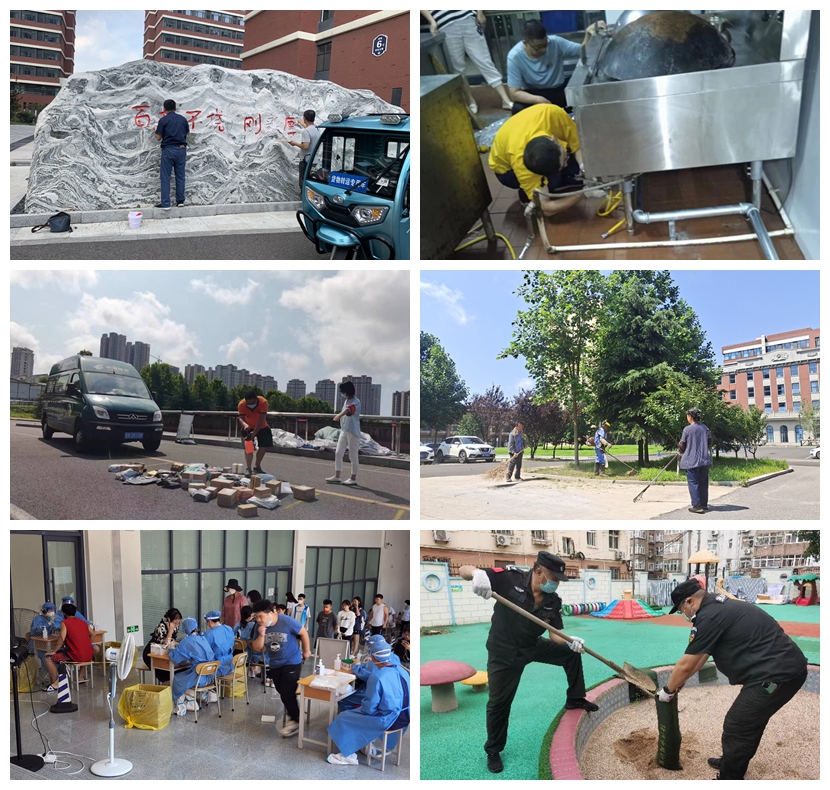 对照要求,后勤管理处及时调整假期工作计划,明确职责任务分工,确保各项工作全面有序展开。各科室积极行动,围绕工作职责,扎实履职尽责。能源与维修服务中心克服工程量大、时间紧、任务重的实际困难,先后顺利完成一千余间学生宿舍的检修,四百余间房间的粉刷和六百余套浴室刷卡设备的检修任务;对校内六十余处建筑物及重点部位组织开展防雷检测,对变电站、变压器、高压柜等设备进行高压预防性实验。二次供水泵站设施清洗、消毒、水质检验,化粪池清理,校园道路维修等各项工作也将有条不紊的推进,确保新学期学生顺利返校入住,平安开学。饮食管理与服务中心在努力为留校师生提供优质便利的饮食供应保障的同时,组织对各餐厅烟道进行清理,对慧园餐厅燃气管道进行维修改造更换,对祥园餐厅明档窗口进行隔断安装,切实消除各项安全隐患,保障食品安全。校园与物业管理服务中心严格监管物业公司,按计划对草坪及灌木进行修剪,对乔木、灌木进行预防性病虫害喷药,对校园卫生死角、楼宇门窗、水体表面漂浮物进行的全面彻底清理;组织专人按时到岗开展巡查,加大经营网点监管力度,确保食品卫生、服务质量、疫情防控、快递静置等有效落实,切实保障师生权益。校医院坚持防疫值班,24小时全天候在岗,放假至今,已累计完成在校高暴露人群核酸采集、样本转运和每周两次在校人员全员检测近三万人次。为保障教职工体检工作有序进行,校医院细化体检各项工作流程和细节,做好人员调配、物资筹备等工作,严守疫情防控和医疗保障关,全力守护在校师生的平安健康。幼儿教育中心利用假期组织防汛演练、发热应急处置演练,进行房屋维修,为新学期开学做好准备。