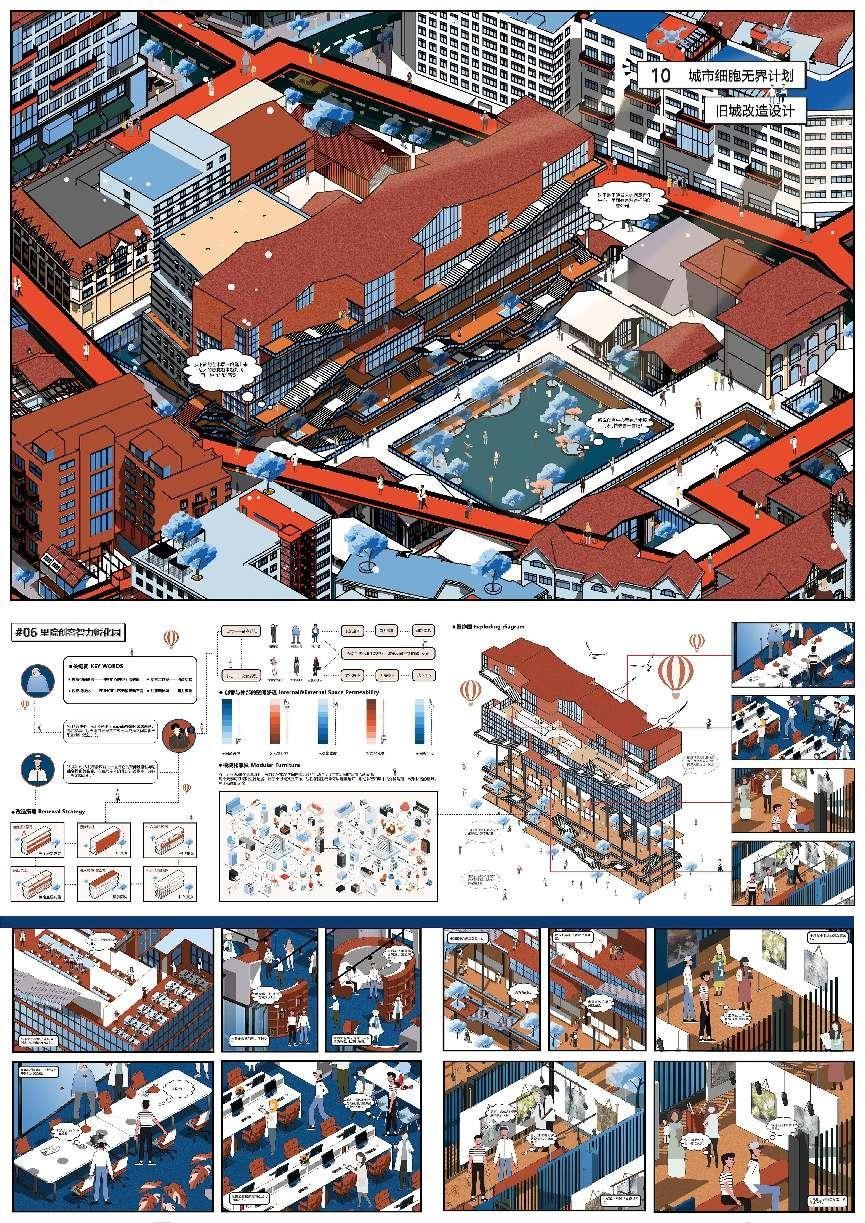 作品《城市细胞无界计划——老城更新与改造》场地位于青岛市市南区火车站旁的一片历史街区,临近栈桥和天主教堂等旅游景点,同时是地铁一号线和三号线双线换乘点,具有极高的历史价值。通过现场的调研以及相关资料的收集,团队总结了该片区所存在的问题并提出了城市细胞这一概念,城市细胞是介于城市与建筑单体之间的单位,是构成城市的最小单元,为了打破边界,将宏观的城市问题转换为城市细胞的边界问题,并提出织补设计的手法来达到破界的目的。最终将场地内的细胞分为里院细胞、高层细胞、居住细胞等单元,通过对每种细胞进行不同手法的改造,包括建筑单体,围合出的广场,限定出的街道这三部分运用修复、编织、植入、楔入、修补等等手法的设计,形成没有边界,交织共存的里院新街区。
