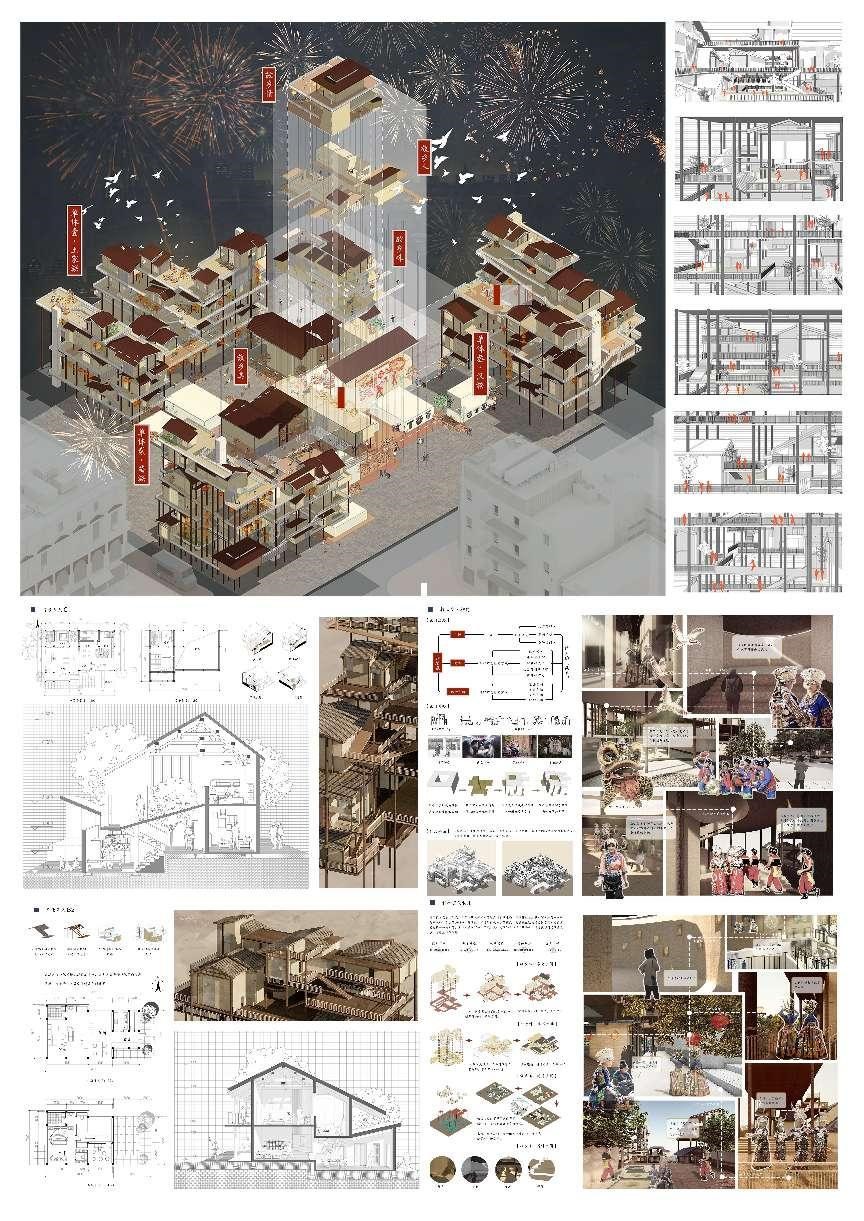 作品《湘遇——演绎传统民居,构建精神时空》对社区建造模式进行思考探索,通过传统民居元素提取,运用到居住单元设计当中,同时通过公共空间和交通空间设计不同提供归属感的空间,以长沙为试点,提取苗族、土家族等民族的传统民居形式,如晒楼、天井、巷道等。共设计16个居住单元和故乡人、故乡味、故乡美、故乡情四类公共空间节点,分别对应集会空间、餐饮空间、展示空间和精神空间,完成社区的构建,注重居民情感和信仰的体现。